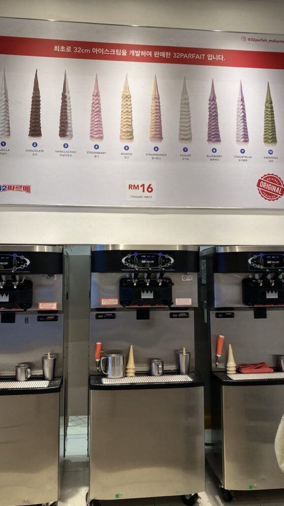 Lokasi bagi Wagyu Skewer dan ais krim ini betul-betul berdekatan. Keduanya berada di Sweet Potato Factory, Lot 10. Untuk pengetahuan semua, Lot 10 ini dapat dilihat di tengah Kuala Lumpur dan menjadi tempat trendsetter untuk fesyen. Memang terasa seperti pelancong bila berada di sana. Kiosk ais krim ini agak kecil di tengah-tengah laluan masuk ke Lot 10. Ais krim di sini agak menarik kerana ia akan diletakkan di atas kon dengan kepanjangan 32cm. Terdapat 10 jenis flavour seperti gambar di bawah ini.
