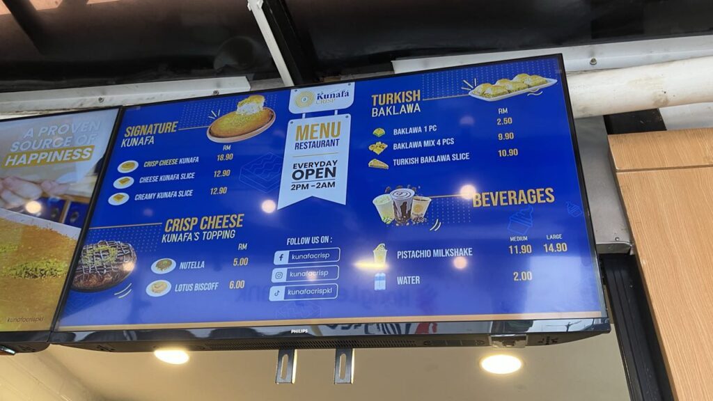 Bagi mereka yang gemarkan dessert Turki boleh pergi ke sini! Disebabkan tiada antara kami yang pernah mencuba kunafa, maka kami memilih signature kunafanya yang dipanggil Crispy Cheese Kunafa. Harganya antara RM12.90-RM18.90 untuk sebungkus kunafa ini. Ia bergantung kepada jenis kunafa yang dipilih. Bagi saya, rasanya seperti roti pratha yang dilapiskan dengan cheese di bahagian bawah. Manakala dari segi teksturnya, rasanya agak rangup. Namun kerangupannya masih mampu dileraikan dengan sudu yang disediakan bersama dengan kotaknya. Dinasihatkan untuk menikmatinya ketika masih panas. Selain itu, kalian juga boleh mencuba Turkish Baklava mereka. Di bawah ini saya sertakan harga untuk menu-menu di sini.