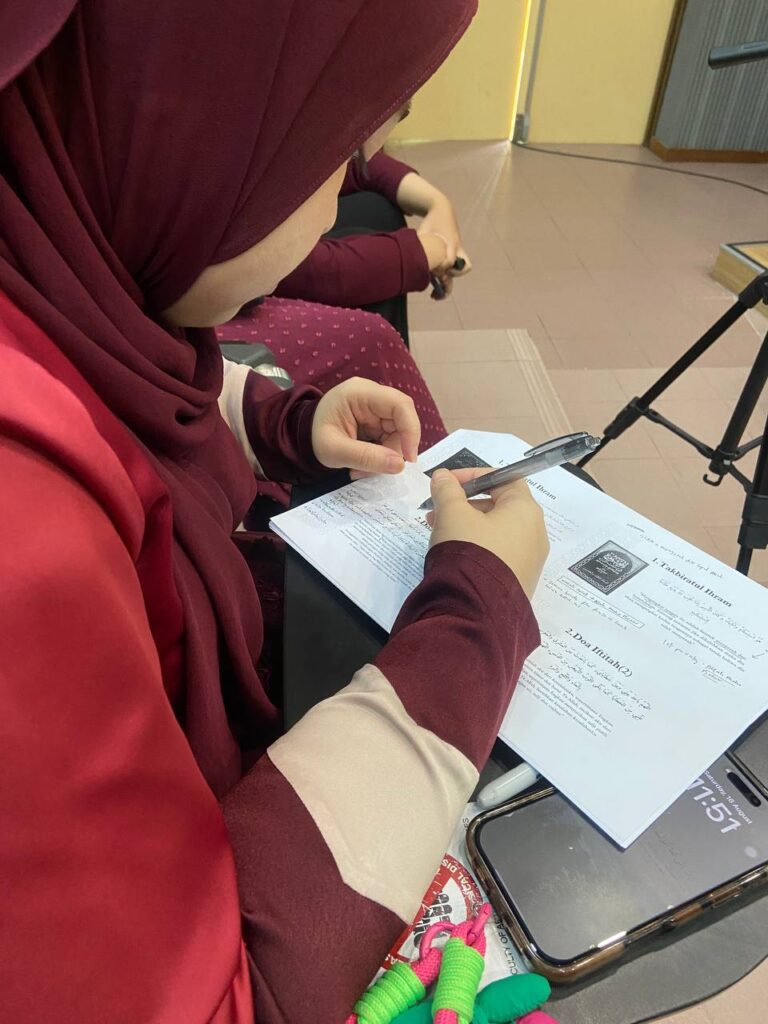 Peserta juga dibimbing dengan tips praktikal untuk khusyuk, antaranya menjaga wudhu’ dengan teliti, membaca doa selepas azan, dan memperbanyakkan istighfar. Semua ini membantu hati lebih dekat menghayati makna bacaan dalam solat.