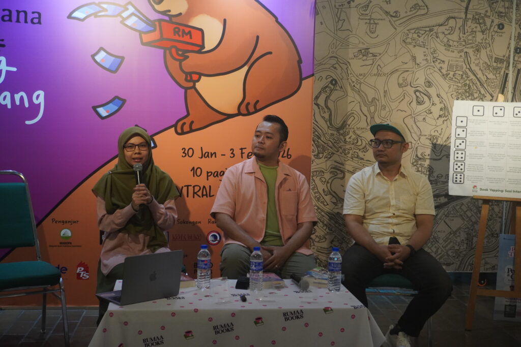Sesi soal jawab dan perkongsian berkenaan buku bersama penulis IMAN (Dari kiri: Alia Husna, Aman Wan, Aidil Ghazali)